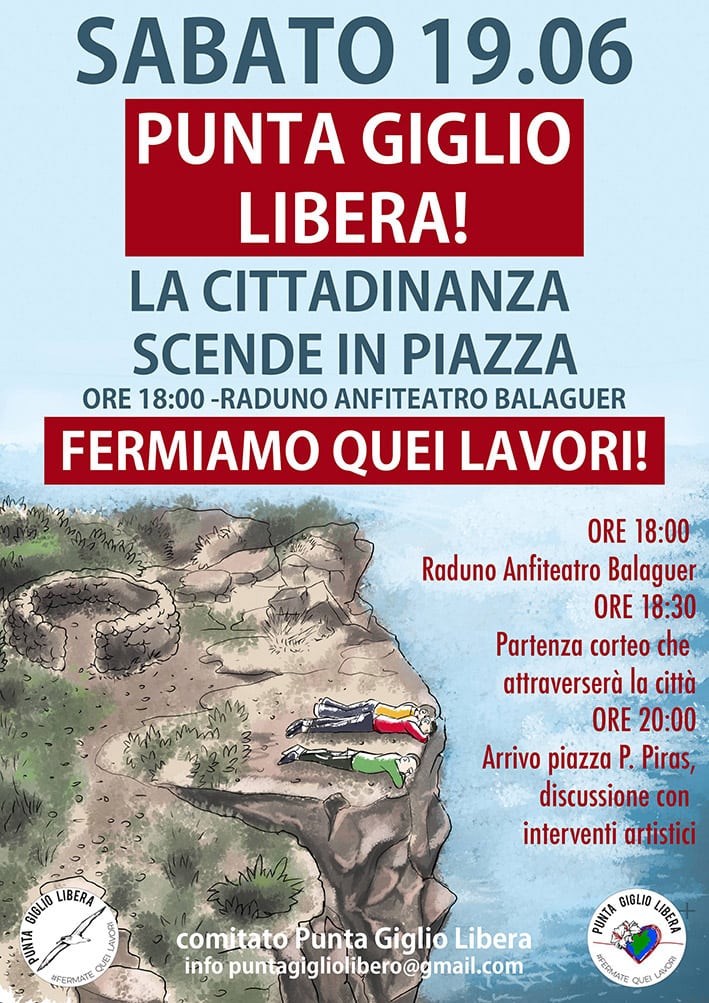 Le attiviste e gli attivisti del comitato saranno presenti con materiale informativo, e sarà allestito il banco di raccolta firme e fondi, per chiedere al sindaco di Alghero, e alle altre istituzioni coinvolte, di fermare i lavori e liberare Punta Giglio, e accertare la regolarità della procedura di autorizzazione dei lavori in corso.